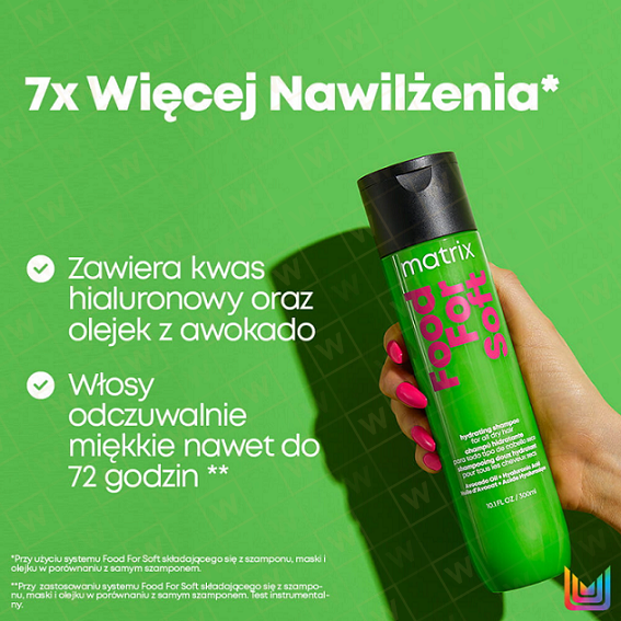 Matrix Food For Soft to profesjonalna, intensywnie nawilżająca gama od Matrix do pielęgnacji wszystkich rodzajów suchych włosów. Świetnie sprawdzi się także do pielęgnacji włosów wysokoporowatych i po zabiegach koloryzacji. Zawiera olej z awokado i kwas hialuronowy.